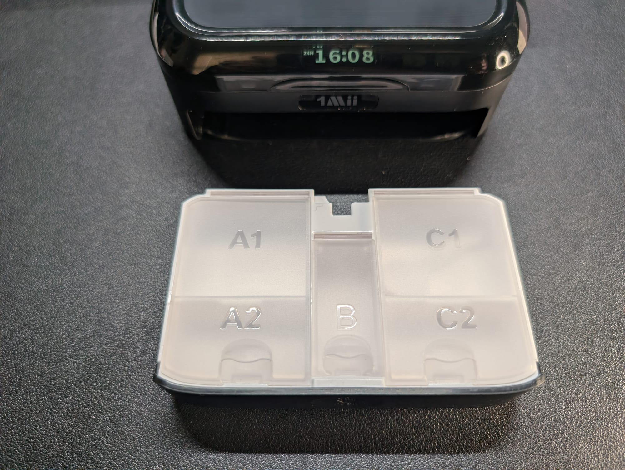 It's large mainly because in addition to being a charging case for the earphones, it also has space for pill storage via a drawer with five compartments helpfully labeled A1, A2, B, C1, and C2. In one of the compartments a tiny spoon is available to help you scoop out the pills and capsules you put in the compartments. There are semi-transparent plastic doors over the compartments so you can see what's inside them without having to open the doors.