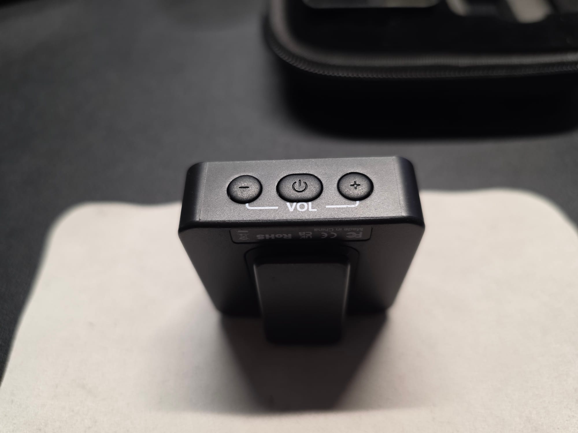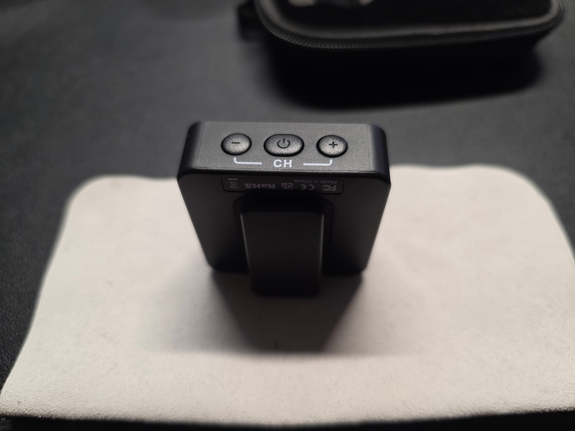 The bottom of the transmitter has buttons to change the broadcast channel and a middle button for turning it on and off. The receiver has the same buttons, but the outer buttons control volume. There is a switch on each to change between stereo and mono.