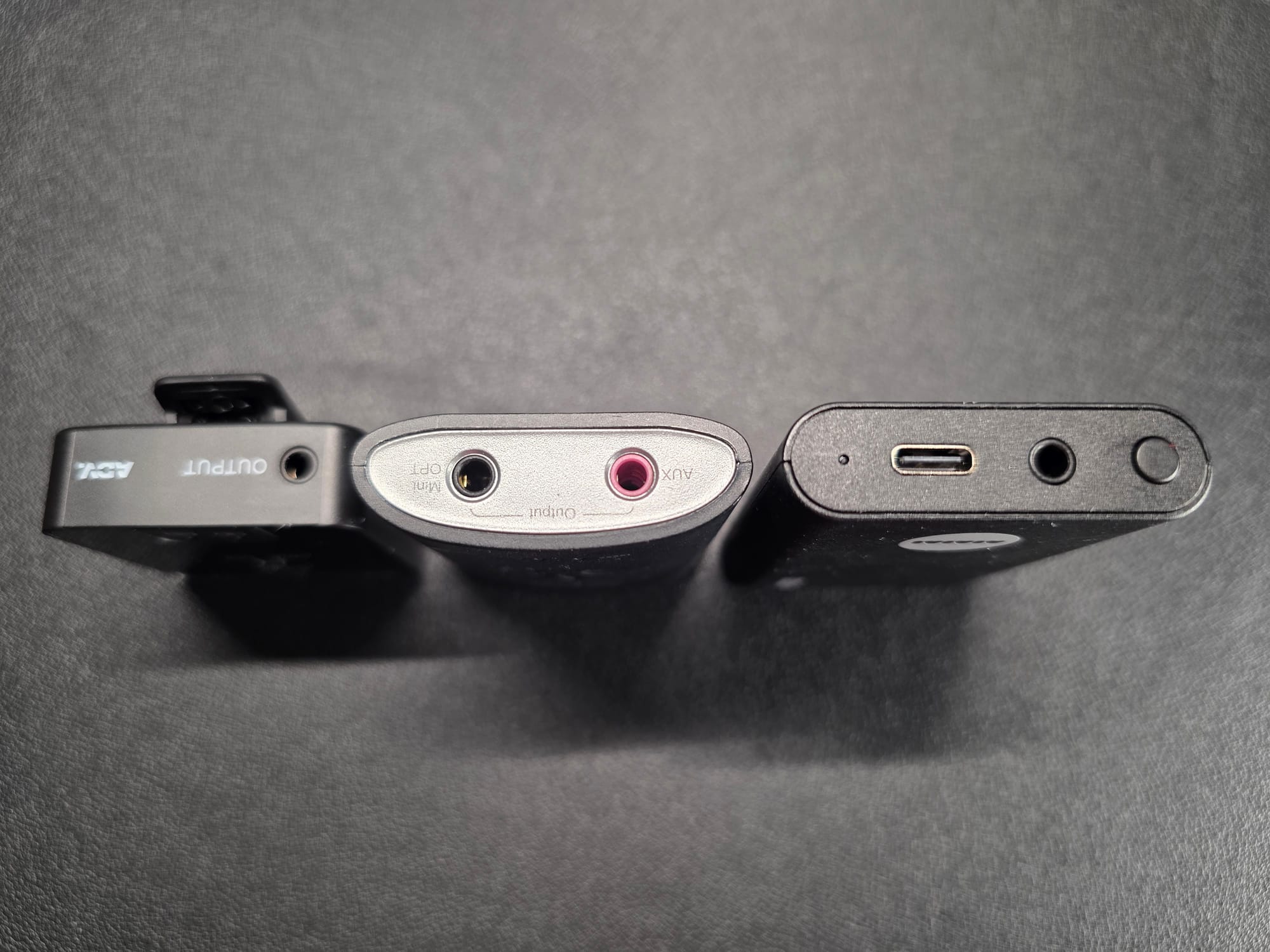 Each has a USB C port for charging and a 3.5mm jack for attaching the aux cable.